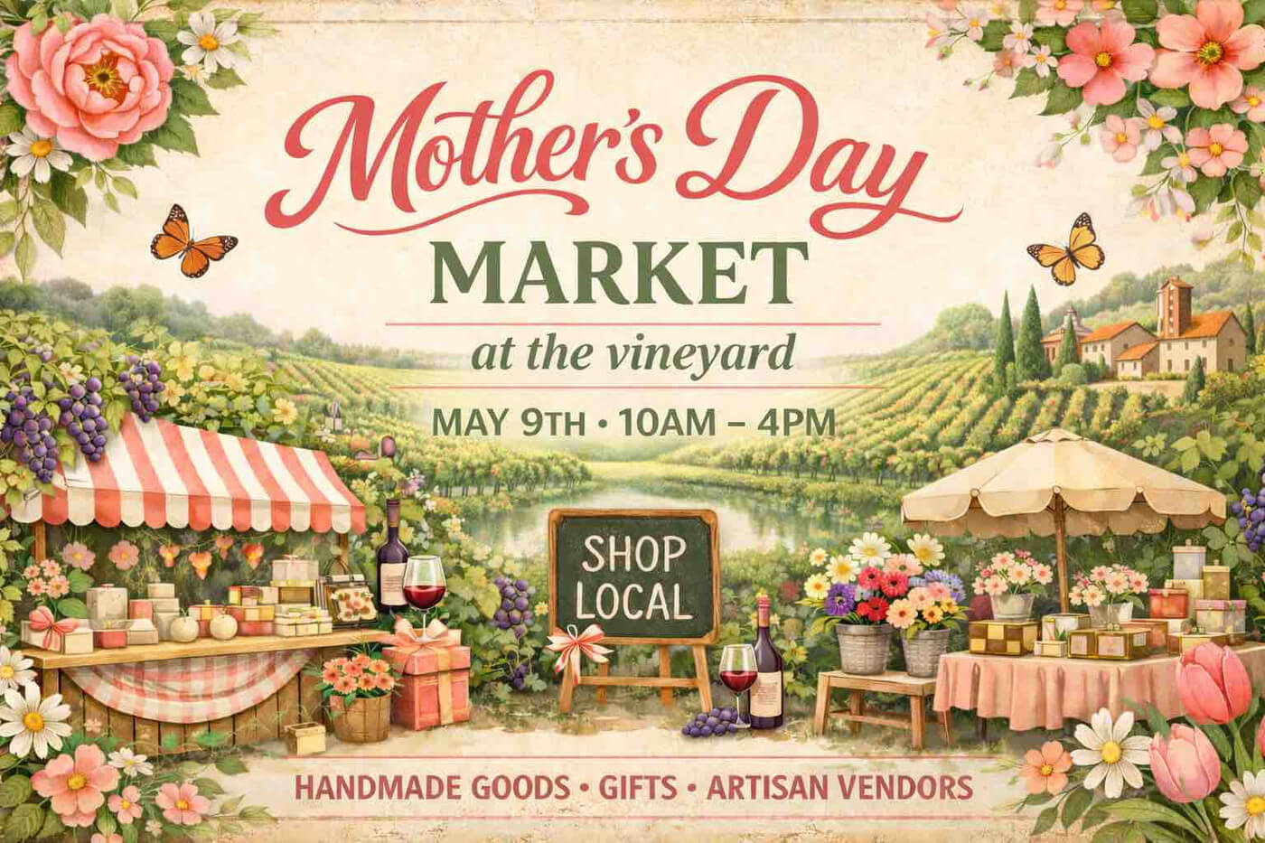May 9th, 2026 | 10:00 AM – 4:00 PMCelebrate Mom (or yourself—because honestly, that counts) with a relaxing spring day at the vineyard.Our Mother’s Day Market brings together a curated lineup of local artisans, makers, and small businesses in a beautiful vineyard setting—complete with wine, fresh air, and plenty of reasons to linger.